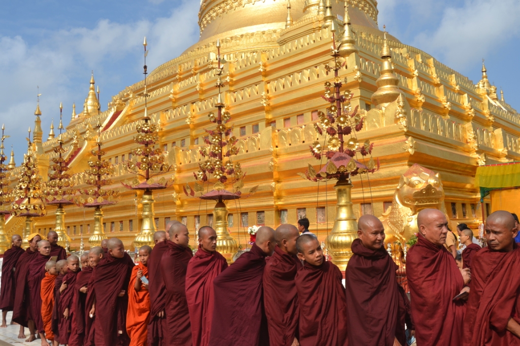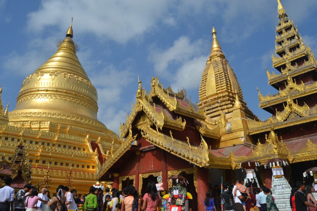 Como primer destino fijamos la pagoda Shwezigon, el sitio de peregrinaje más importante de la zona y que es, a su vez, uno de los templos que más difiere del estilo arquitectónico típico de Bagan.