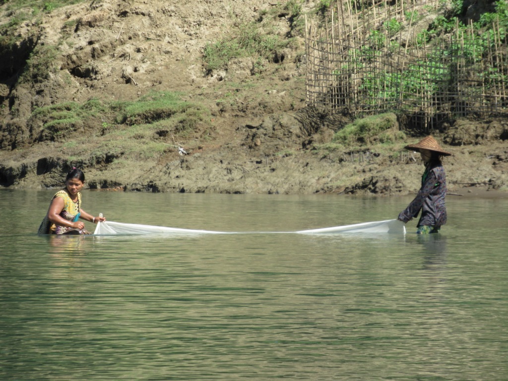 Siguiendo por el río hacia el norte visitamos dos aldeas más. En la primera coincidió que dos chicas estaban pescando con una enorme red justo cuando llegamos.