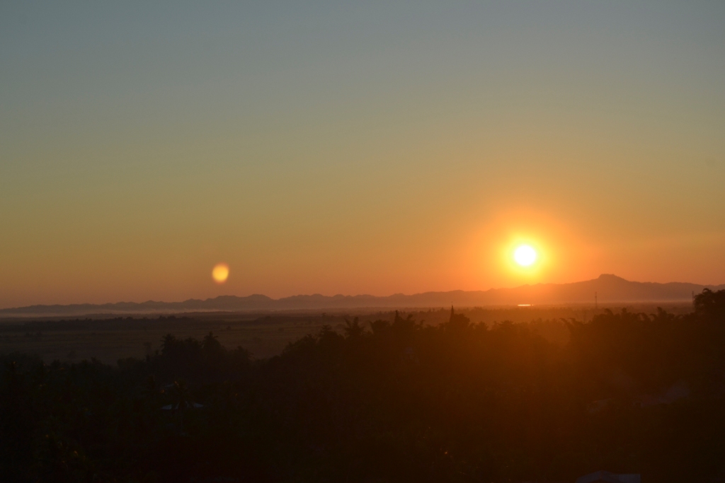 El tercer y último día en Mrauk U vi la puesta de sol desde un mini-montículo con unas vistas parecidas al Discovery View Point.
