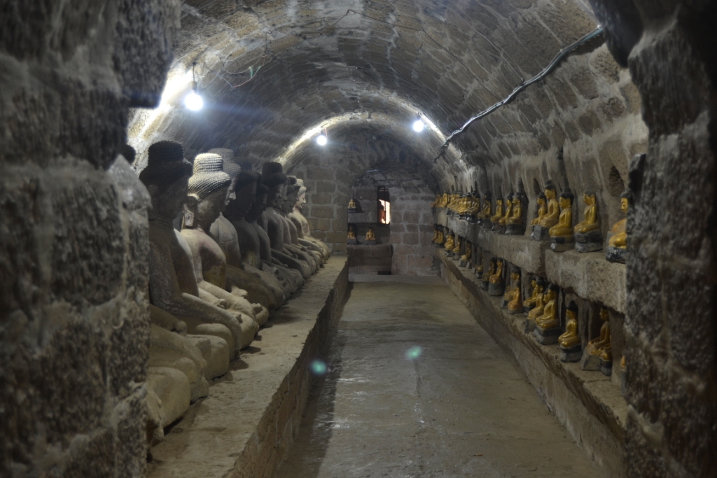 Los muros de estos pasillos están grabados con miles de mini-Budas, formando un mosaico continuo que se va intercalando con figuras de Budas de tamaño más considerable.