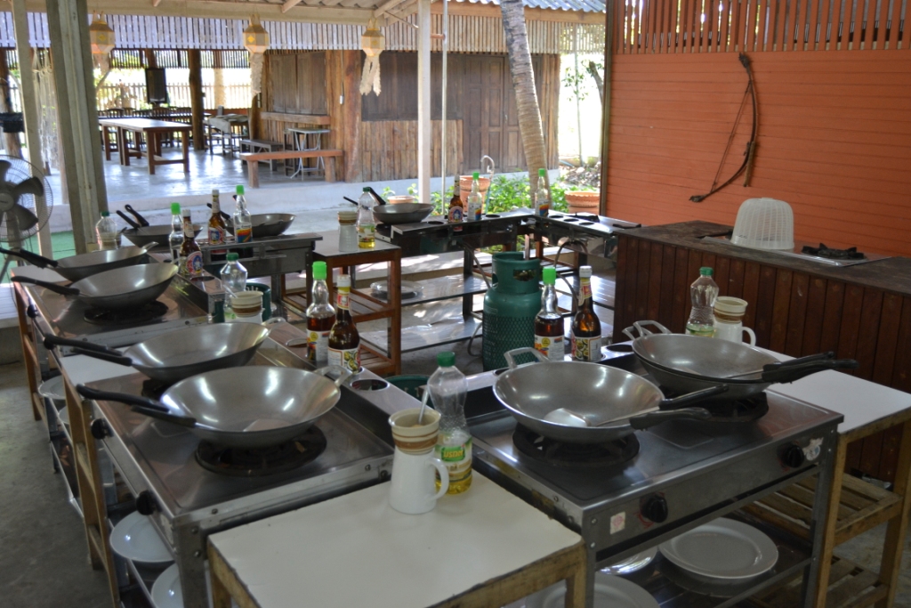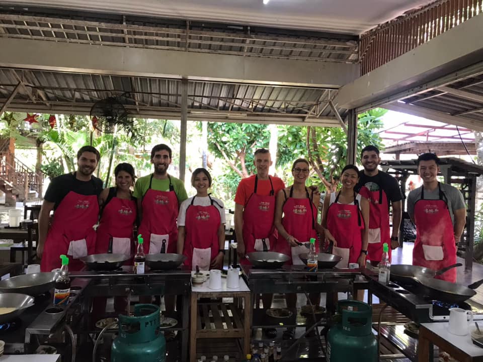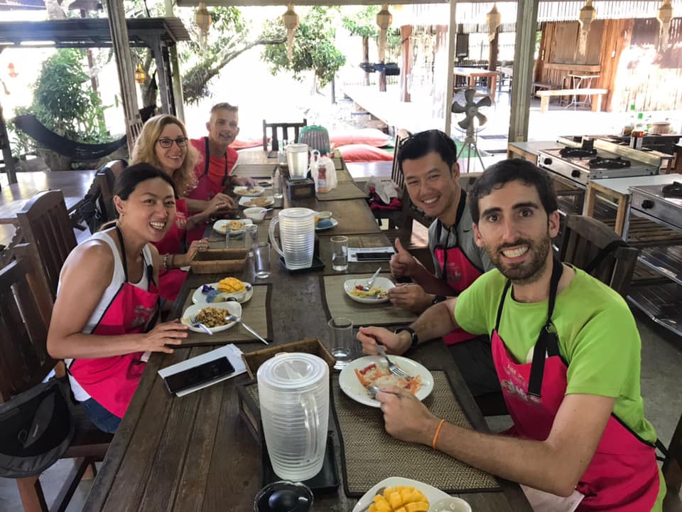 El precio era algo elevado (1200 Baht), pero incluía la recogida en el hostal, el curso de casi todo el día en la granja para preparar siete platos diferentes, una visita a un mercado local para comprar algunos de los ingredientes y también un recetario impreso para llevarnos a casa.