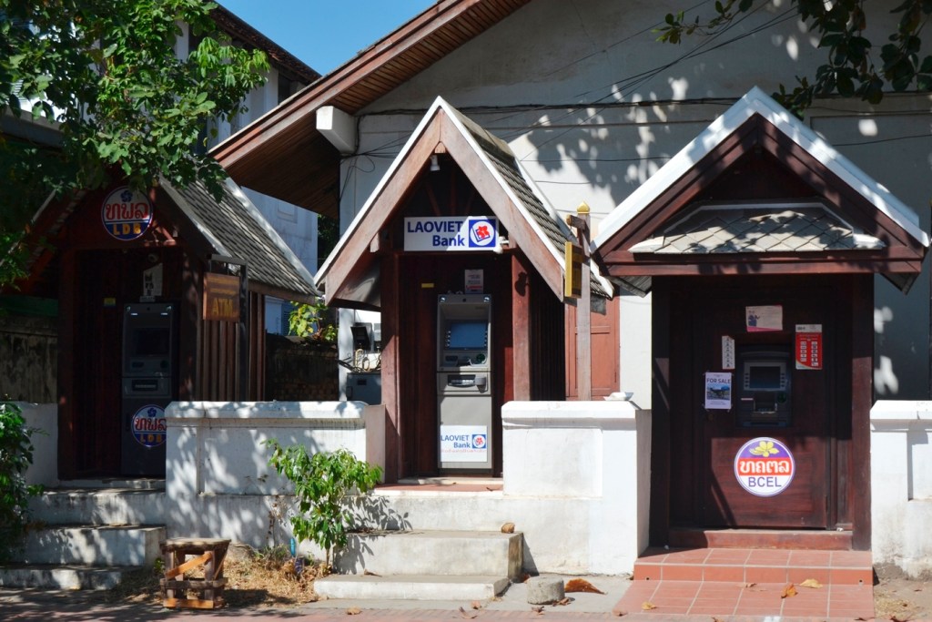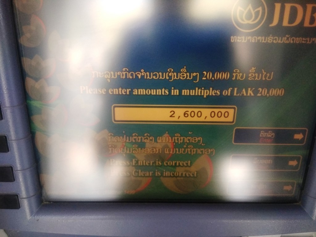 Moneda: La moneda oficial de Laos es el Kip que tiene un cambio bastante sencillo de manejar (algo que, por una vez, no está mal). Unos días antes de empezar el viaje, el cambio era aproximadamente 1 € = 10.000 KIP por lo que las conversiones son muy fáciles una vez nos adaptemos a pagar en cantidades con muchos ceros. Se puede sacar dinero en los cajeros (como el de las fotos de Luang Prabang) que hay en la mayoría de las ciudades y muchos establecimientos aceptan pagos con Visa o Mastercard.