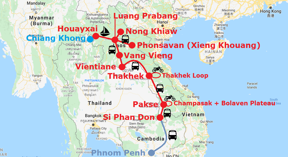 Una vez decidido que iba a pasar por cuatro países del Sudeste Asiático en sentido horario y empezando en Bangkok, Laos quedó situado después de Myanmar (bueno, realmente después del norte de Tailandia) y Camboya.