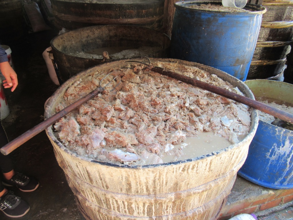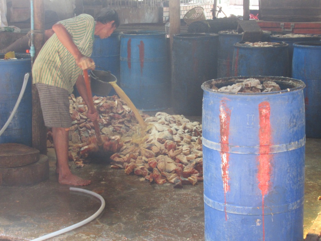 El camino siguió llevándonos por zonas algo más rurales hasta llegar a una fábrica de Prahok, una pasta de pescado aplastado, salado y fermentado que se usa mucho en la cocina camboyana para dar sabor.