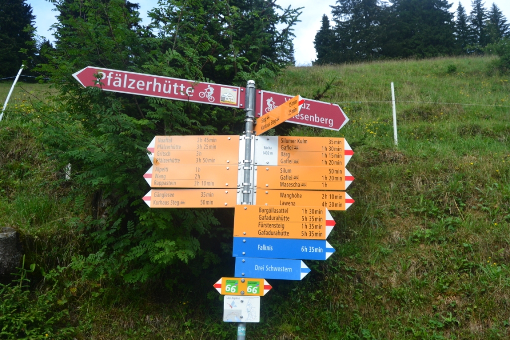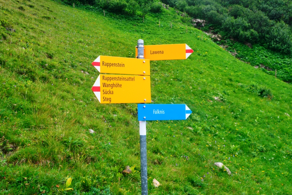 Como norma general, debemos seguir las indicaciones hacia el Rappastein, pero teniendo en cuenta que coincida también con la misma dirección que el Falknis (señalizado en azul). Esto nos sirve para la mayor parte de la ruta. Cuando pasemos el Rappastein, será suficiente con seguir las indicaciones hacia Lawena.