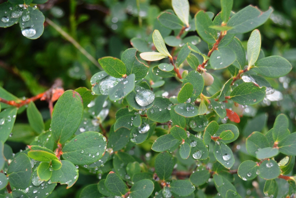 Tras un rato por el bosque, empecé a salir a claros con otro tipo de vegetación, más tirando a pequeños arbustos y algún que otro árbol suelto. Las gotas de la lluvia seguían posadas sobre las hojas, y el valle de Valüna iba ganando cada vez más protagonismo e intensidad en el trascurso de la ruta.