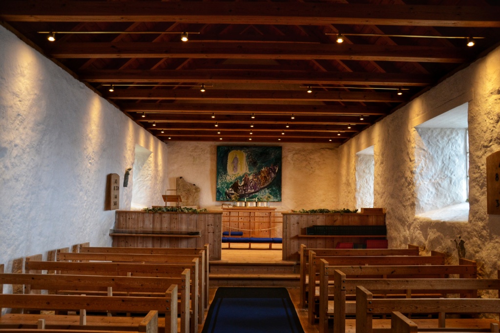 Se construyó en el año 1975 y causó inicialmente bastante controversia por el choque que suponía con la estructura y arquitectura habitual del resto de iglesias de las islas (y de las casas en general).