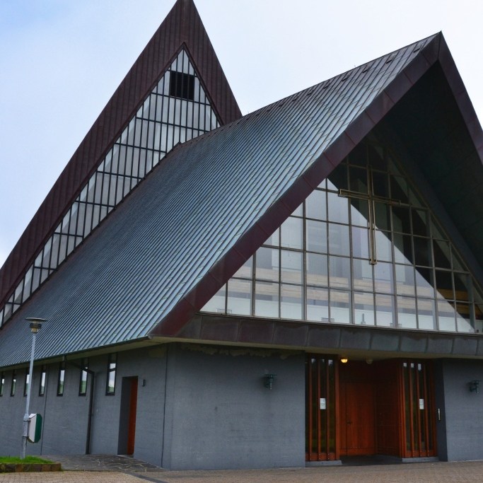 Vesturkirkjan: iglesia curiosa, geométrica (y algo surrealista) que destaca a la vista por su forma piramidal en un barrio en el que las casas no pasan en general de dos plantas de altura.