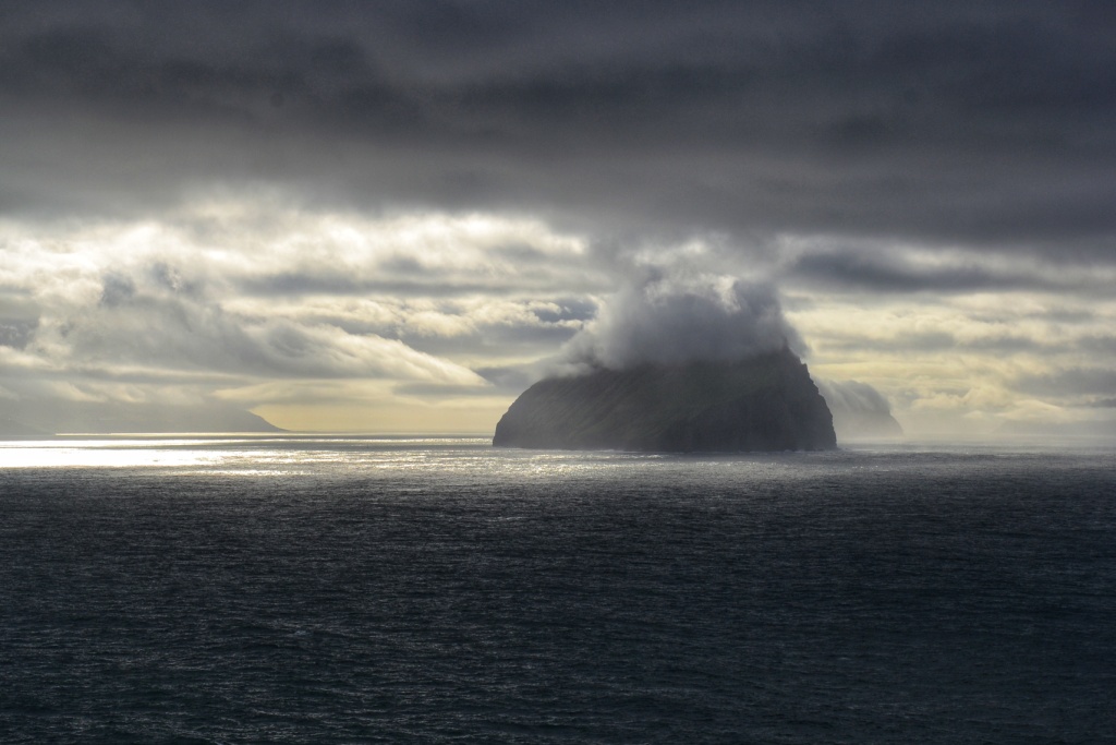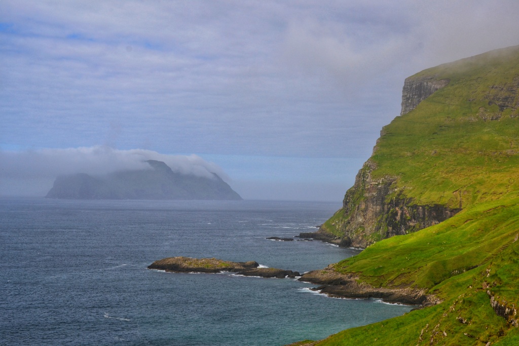 Siempre con Koltur a nuestra derecha, llegamos al final del sendero que nos dejó con la impactante vista de esta estaca de 313 metros de altura y que ejerce de guardiana en la entrada del fiordo al este de Sandavágur.
