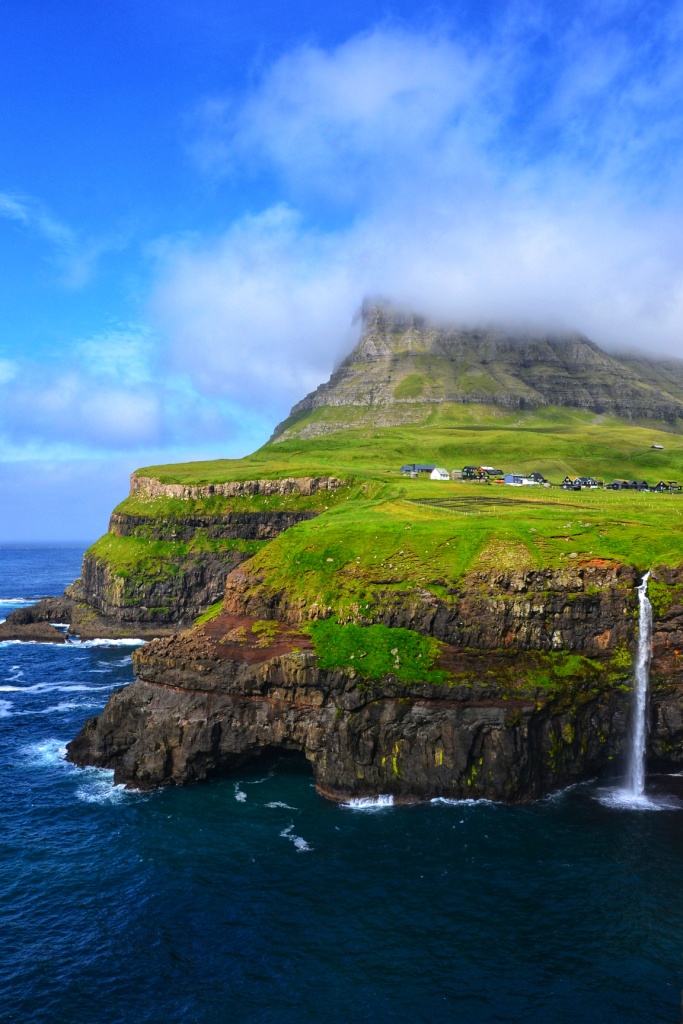 No me extraña que sea un lugar tan fotografiado… La verdad es que resulta hipnótico ver cómo cae el agua mientras las nubes o nieblinas van devorando y soltando la cima de la montaña Heinanøva, bajo cuya ladera se encuentra el poblado de Gásadalur.