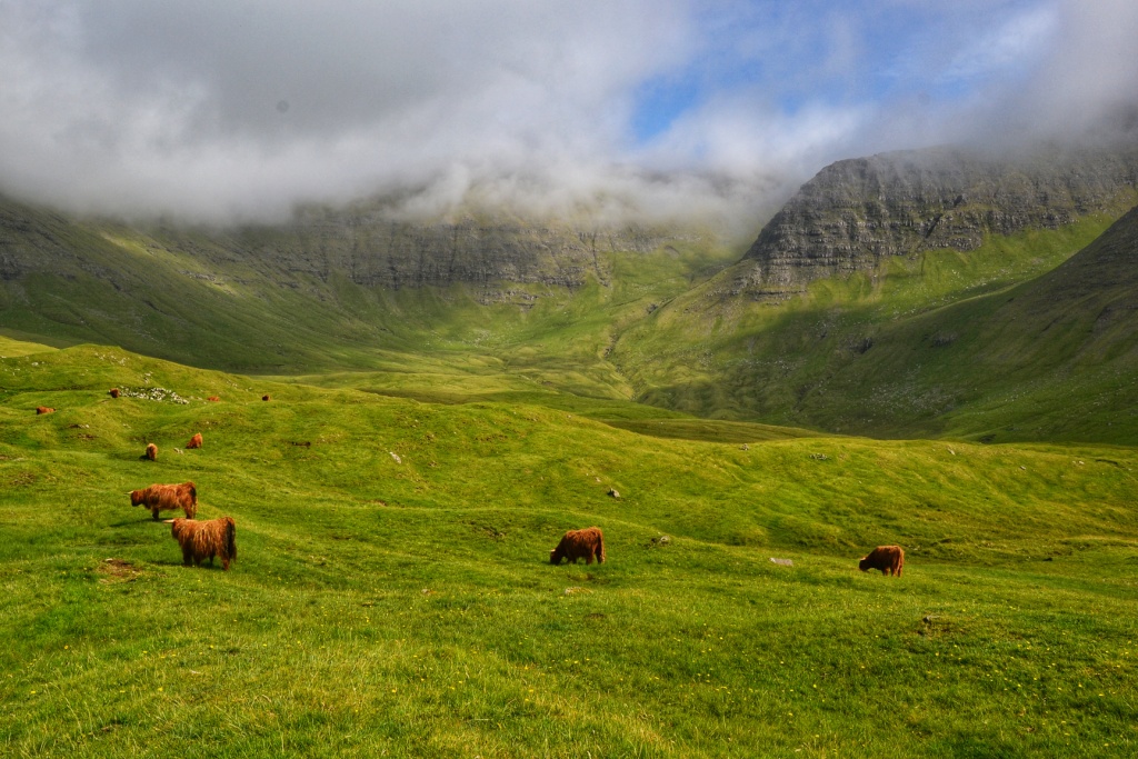 Abriendo con cuidado la puerta se accede a un inmenso valle glaciar habitado por un formidable rebaño de vacas escocesas (las «Coo» que había visto en 2014 en Escocia).