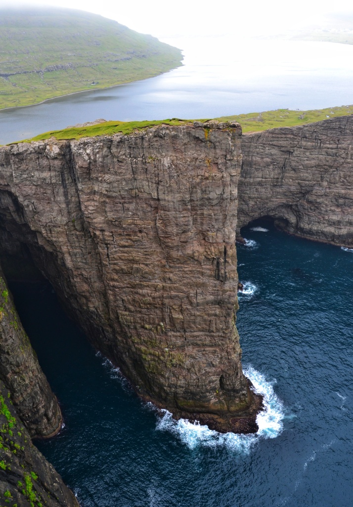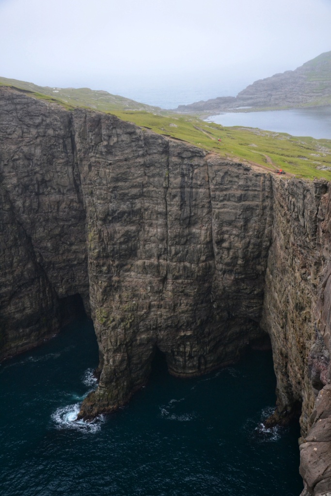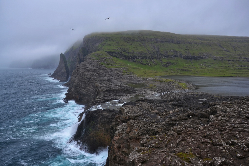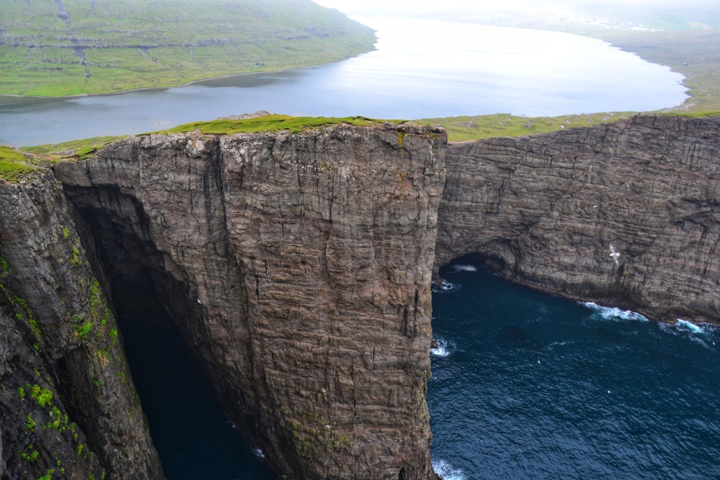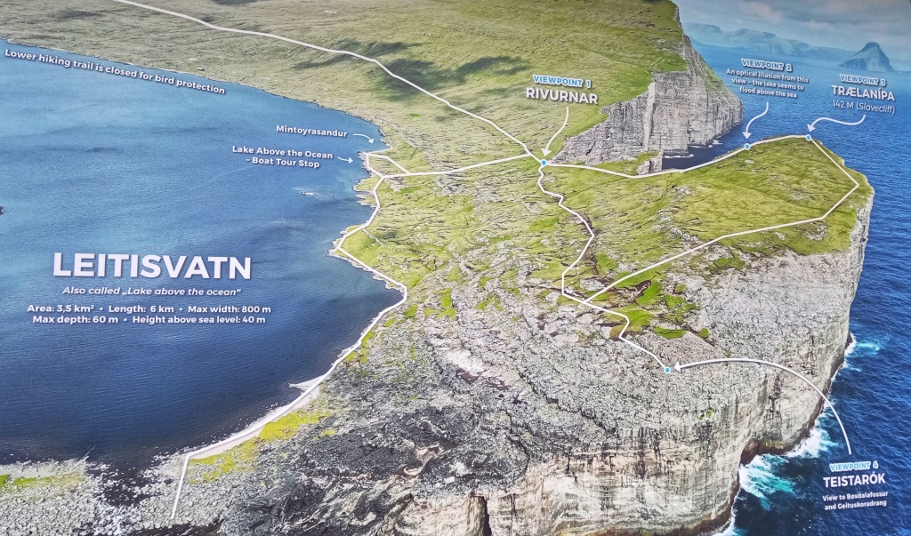Desde este mirador hay que volver un poco sobre nuestros pasos y empezar a ascender caminando hacia el sur para llegar a lo alto de Trælanípa, una especie de meseta con un corte vertical de 142 metros de caída directa al mar y que ofrece una vista espectacular del lago Sørvágsvatn «colgado» encima del Océano Atlántico.