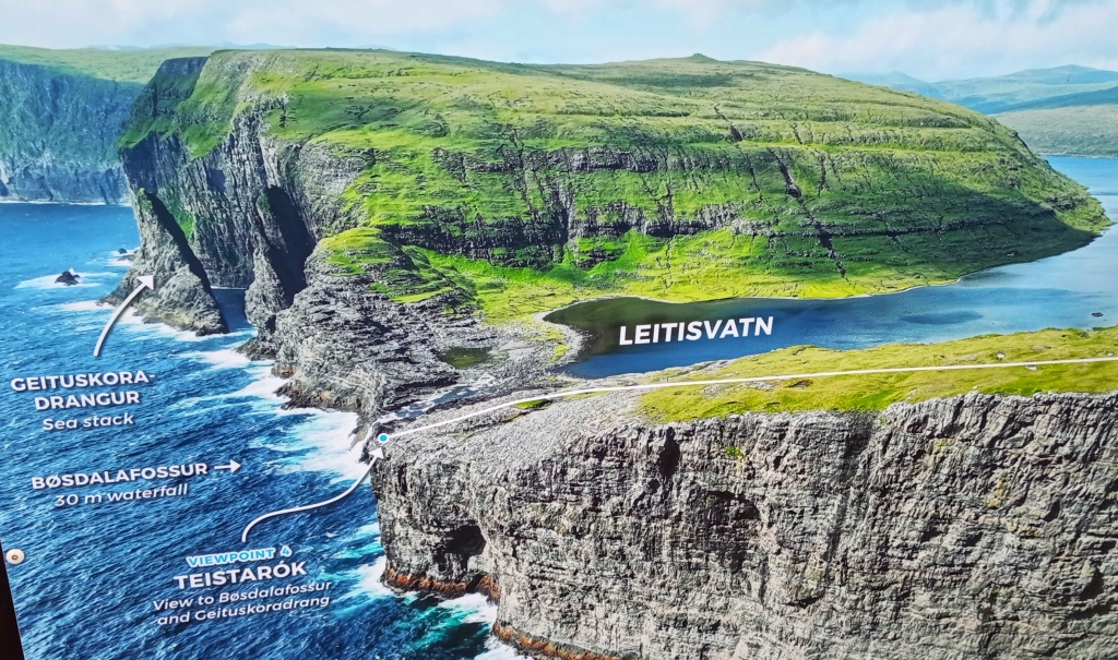 La mejor opción es caminar primero todo recto siguiendo el camino que bordea el lago hasta el punto conocido como Teistarók. Desde aquí hay unas vistas estupendas de Bøsdalafossur (una cascada que sale del lago y cae 30 metros directa al mar) y Geituskoradrangur (una estaca de basalto en forma de pirámide y de 115 metros de altura que parece emerger de las profundidades del mar).