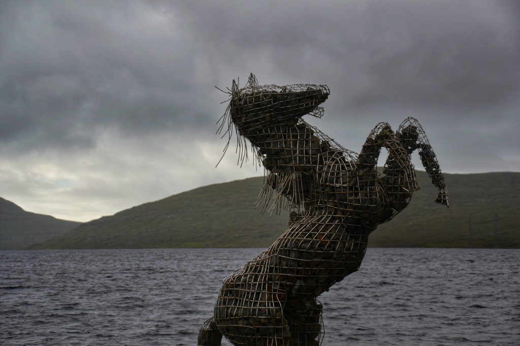 En el extremo norte de Sørvásvatn, cerca de Vatnsoyrar, se puede ver desde la carretera esta curiosa escultura de lo que parece ser un caballo saliendo del lago.