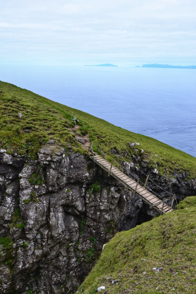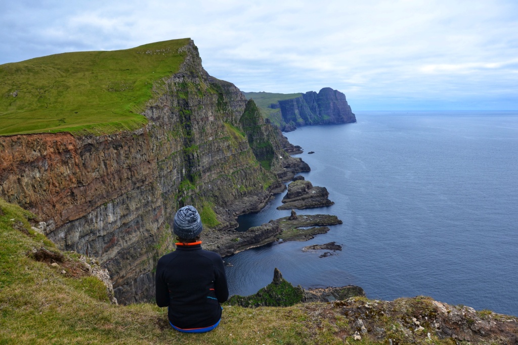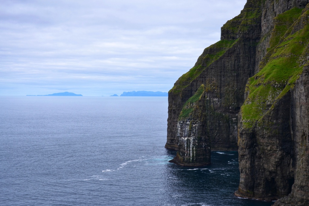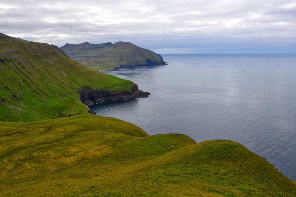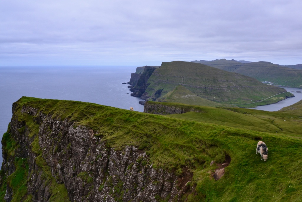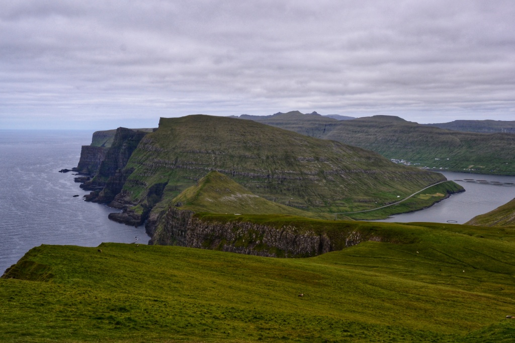 Llega un momento en el que vemos perfectamente todos los acantilados de la costa oeste de Suðuroy hacia el norte, el fiordo Vágsfjørður y parte de Vágur. El efecto óptico es muy curioso porque parece realmente que estamos viendo una isla desde otra isla independiente y que el fiordo se junta con el Océano Atlántico.