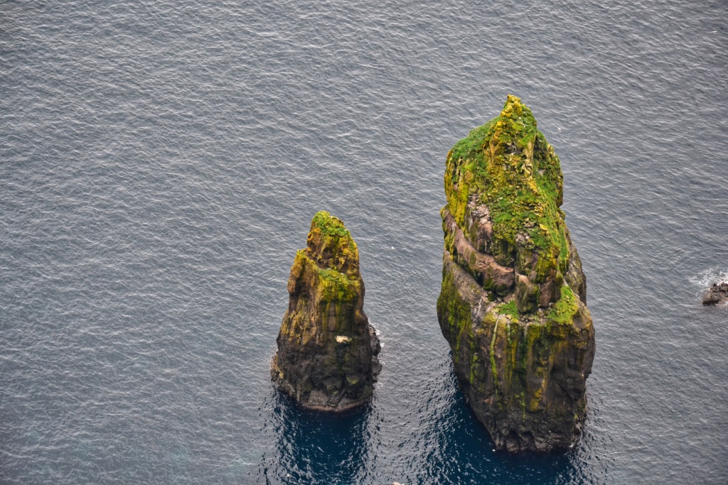 Del mar surgen, como en otros lugares de las Feroe pero sobre todo en Suðuroy, unas estacas rocosas que parecen haber querido independizarse de la línea de costa y reclamar su propio protagonismo.