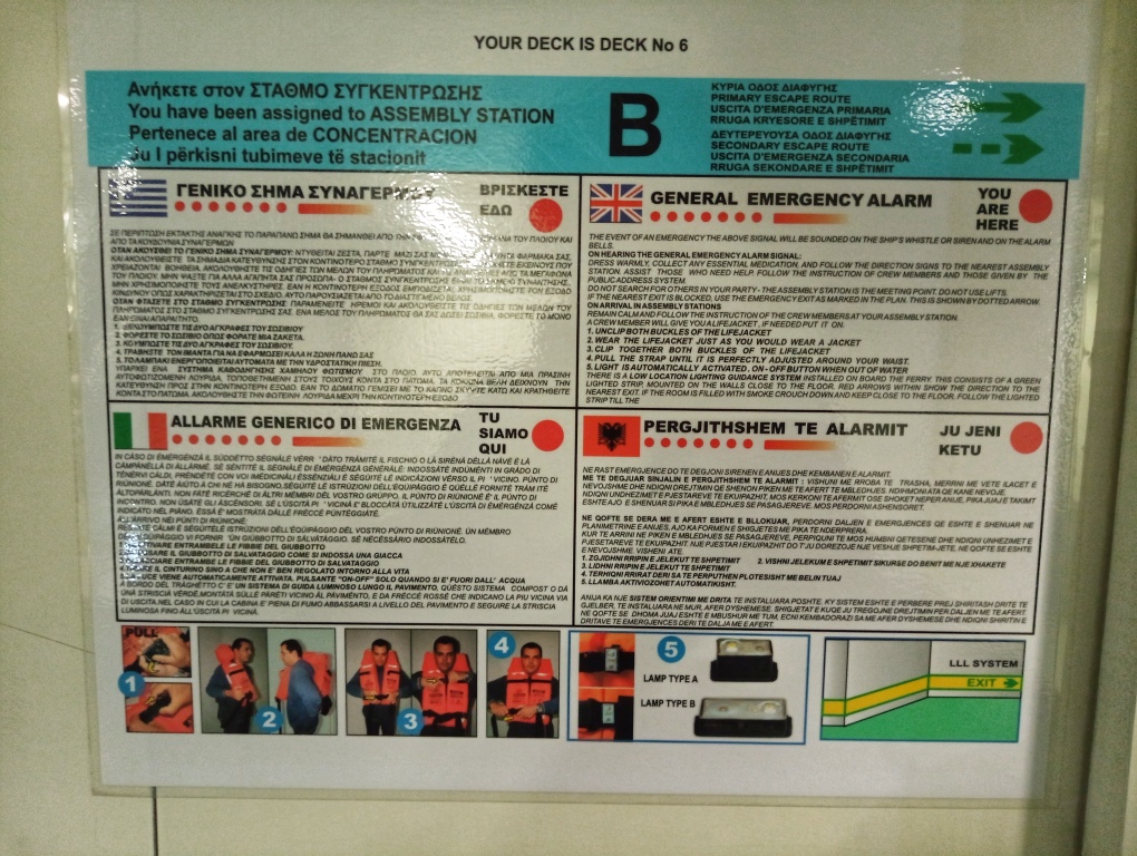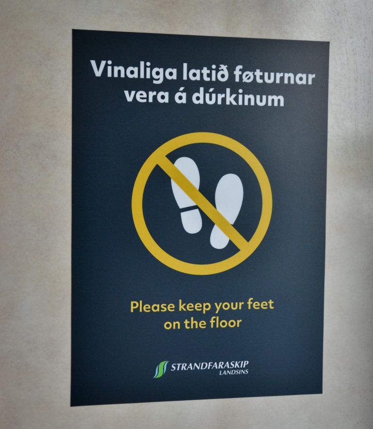 En las dos semanas que pasamos en las Feroe vivimos varios momentos surrealistas y únicos, y el del Galaxy fue uno de ellos. Además de estar pintado como si fuese la nave de los 4 Fantásticos, el ferry parecía ser un megamix extraño de pastiches del Mediterráneo: tenía la bandera de Chipre, los carteles informativos estaban escritos en inglés, griego, italiano y… ¡albanés! (WTF) y, para rematarlo, los carteles indicativos de las estancias estaban en inglés y castellano, e incluso había un «Restaurante Mallorca«, un «Salón Ibiza Music Hall» (muy apropiado el nombre), un «Bar Formentera» y un «Salón Cabrera«.