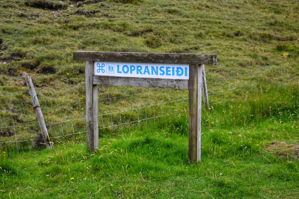 Antes de entrar en el túnel de Lopra, hay que continuar por la pista que sale a la derecha, señalizada como «Um Hestin» (N 61.439112º, O 6.771321) y que claramente se ve cómo va subiendo por las laderas de la cordillera.