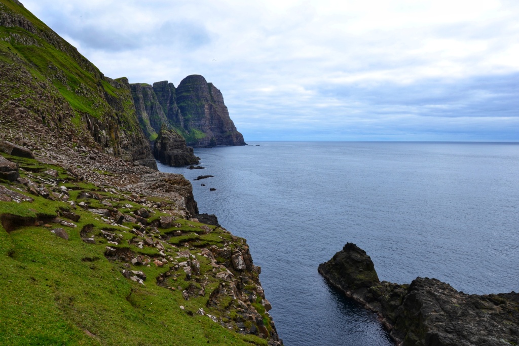 Perno no hay que quedarse solo con esta vista. Siguiendo la línea de los acantilados cuesta abajo, podemos llegar hasta un saliente más o menos llano (como una especie de plataforma flotante) desde donde las vistas son también maravillosas, e incluso se puede seguir descendiendo por la ladera cubierta de césped para tener vistas también hacia el sur.