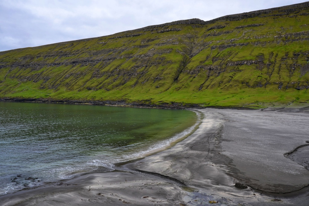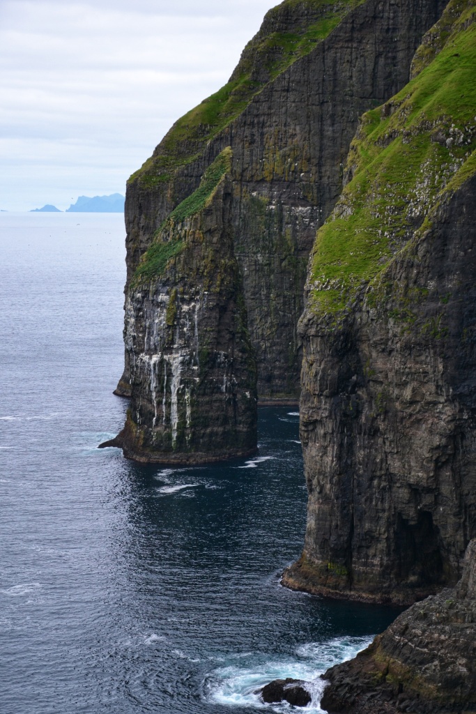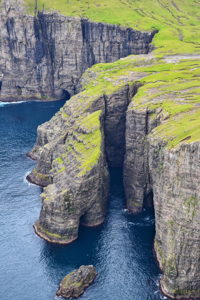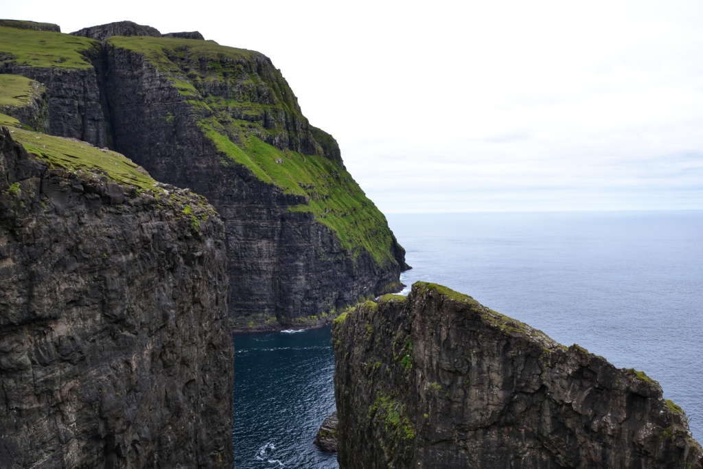 Del mar, emergen un montón de estacas en forma de islotes o penínsulas, destacando Stóritindur, la península más grande, unida a los acantilados por un paso rocoso que ya ha sido colonizado por la hierba de las Feroe.