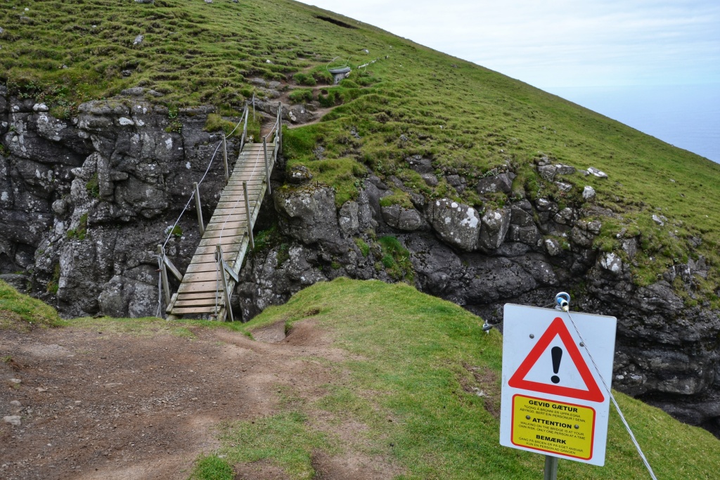 El puente a la vista parece bastante precario y sirve para atravesar un pequeño desfiladero. Hay que recordar que originalmente se puso para que pudiesen cruzar las ovejas (hay incluso una señal que te advierte de que si lo cruzas es bajo tu propio riesgo y responsabilidad).