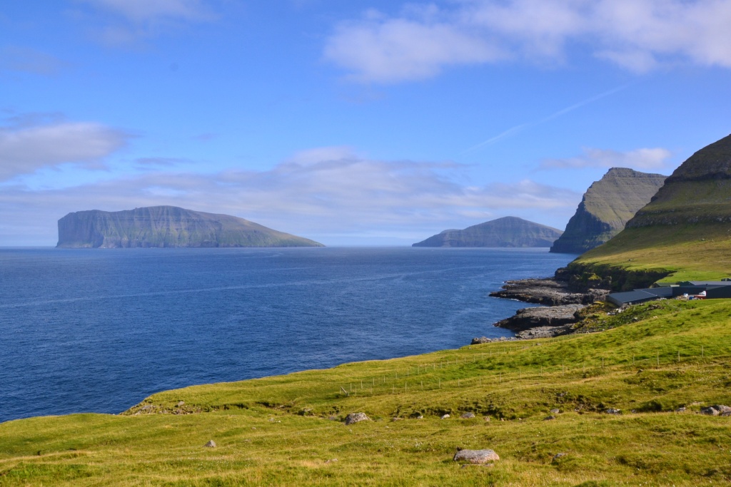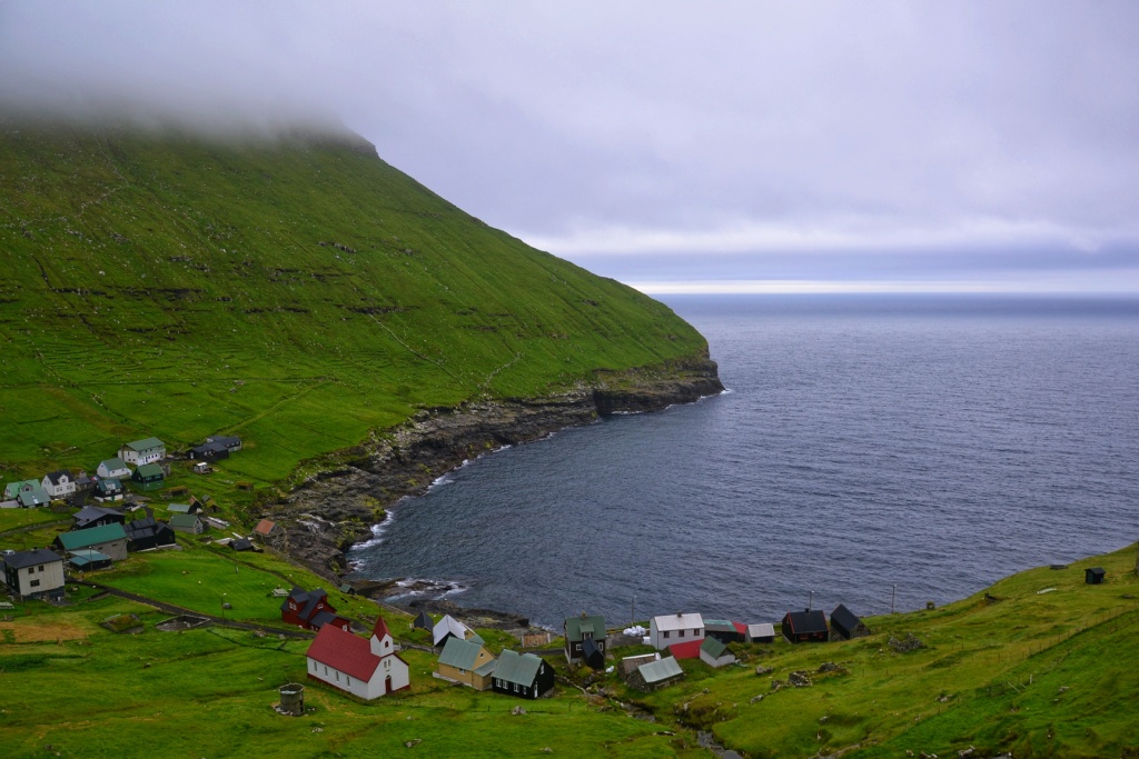 Nos bajamos del barco (sin sustos) en Hattarvík. Desde este pequeño pueblo de menos de 20 casas enclavado en un precioso valle redondeado existen varias rutas disponibles: el pico Eystfelli (449 m) y su faro, la montaña Klubbin (621 m) o la ruta costera hasta Kirkja, que fue la que hicimos.