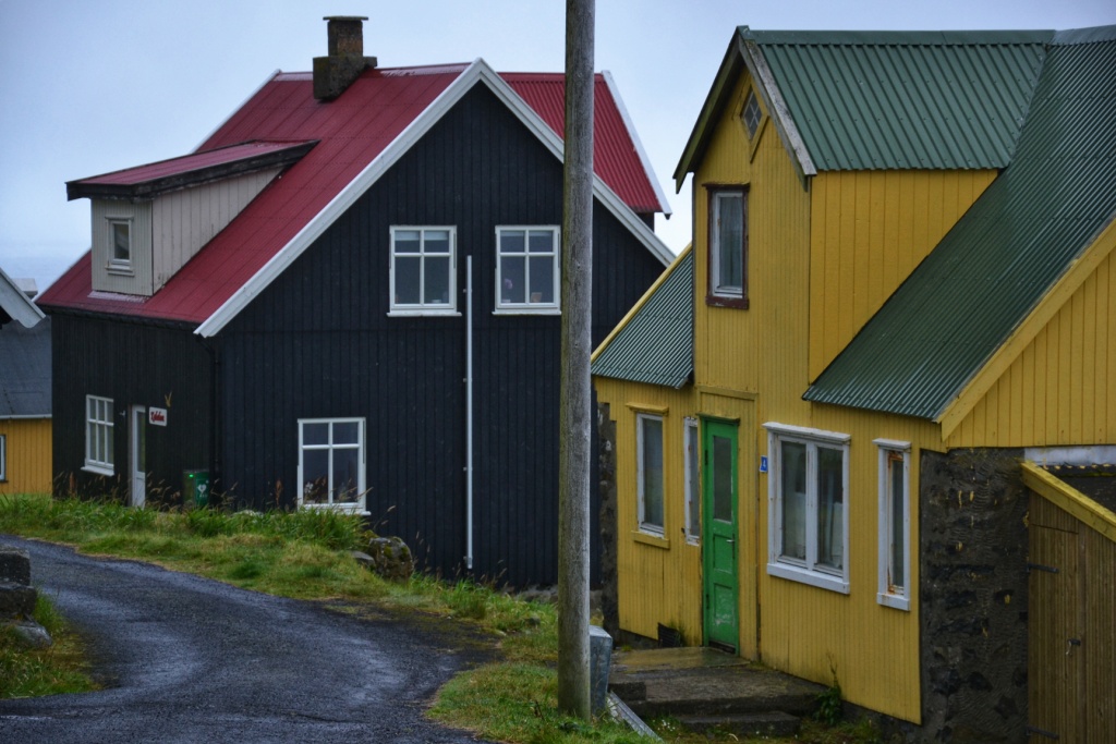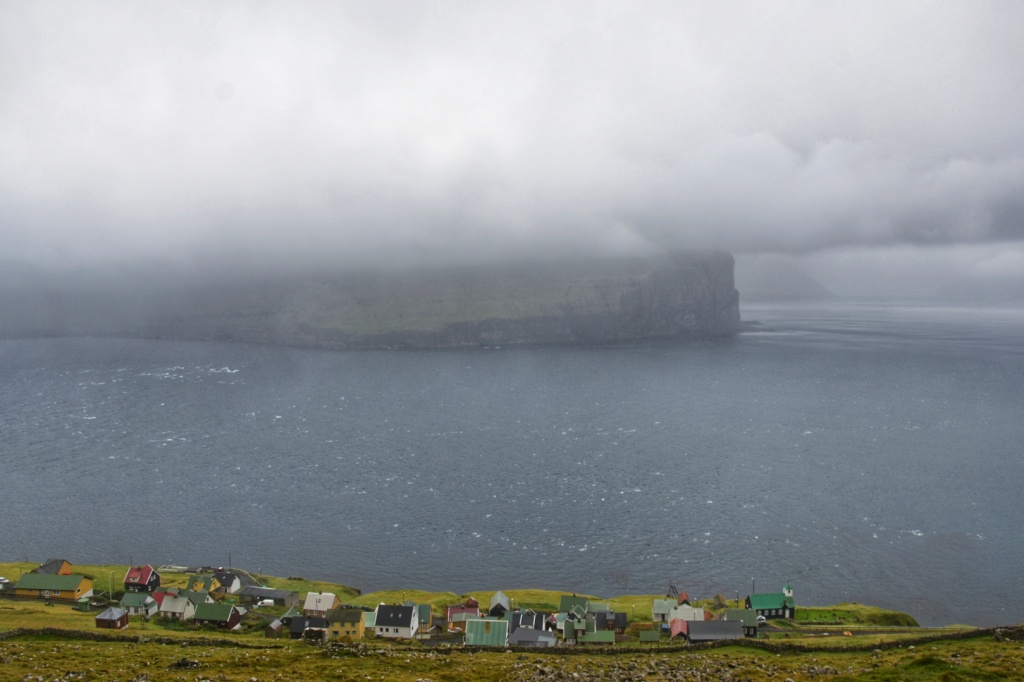 El pueblo no destaca por su belleza pero sí por su ubicación, mirando directamente a Svínoy y Viðoy. Nos quedaba una hora y media para la salida del helicóptero y estaba lloviendo. Un panorama bastante lamentable.