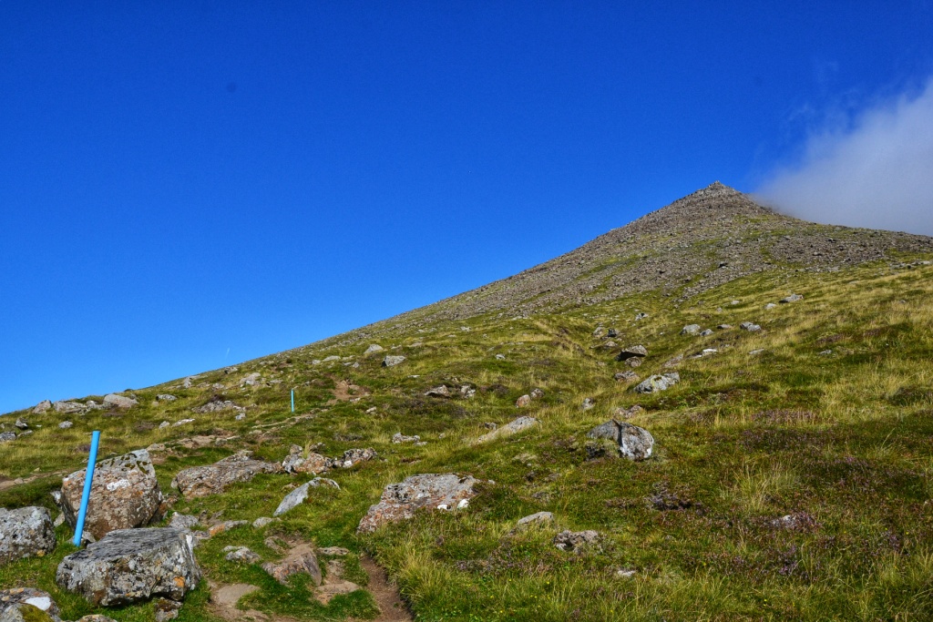 La subida hacia lo alto del Villingardalsfjall se hace en una progresión ascendente casi continua que va, poco a poco, incrementando el nivel de inclinación. No hay que realizar trepadas en ningún momento pero sí que a medida que nos acercamos a la cima la ruta se va haciendo más exigente.