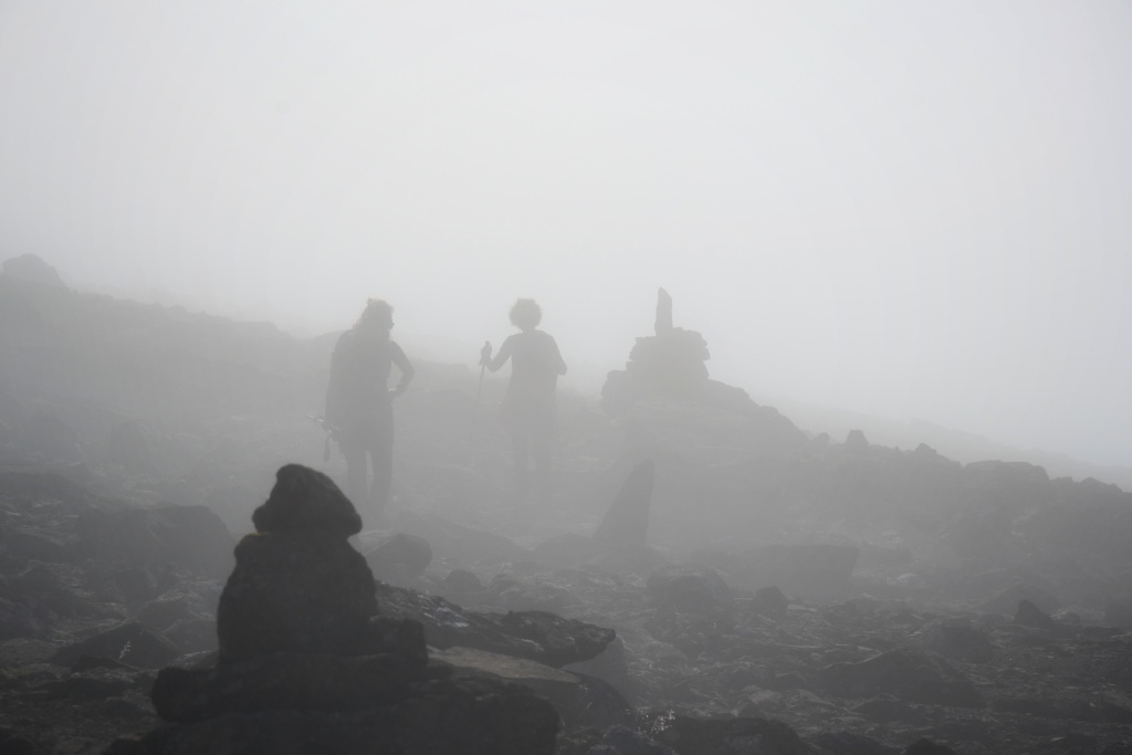 Desde la cima del Villingardalsfjall (a la que sí llegamos) hay que continuar aproximadamente un kilómetro hacia el norte para llegar hasta el mirador de los acantilados de Enniberg. Lo que ocurre es que nosotros nos vimos de repente envueltos en una niebla muy espesa que no nos dejaba ver nada que estuviese a más de 20 metros.